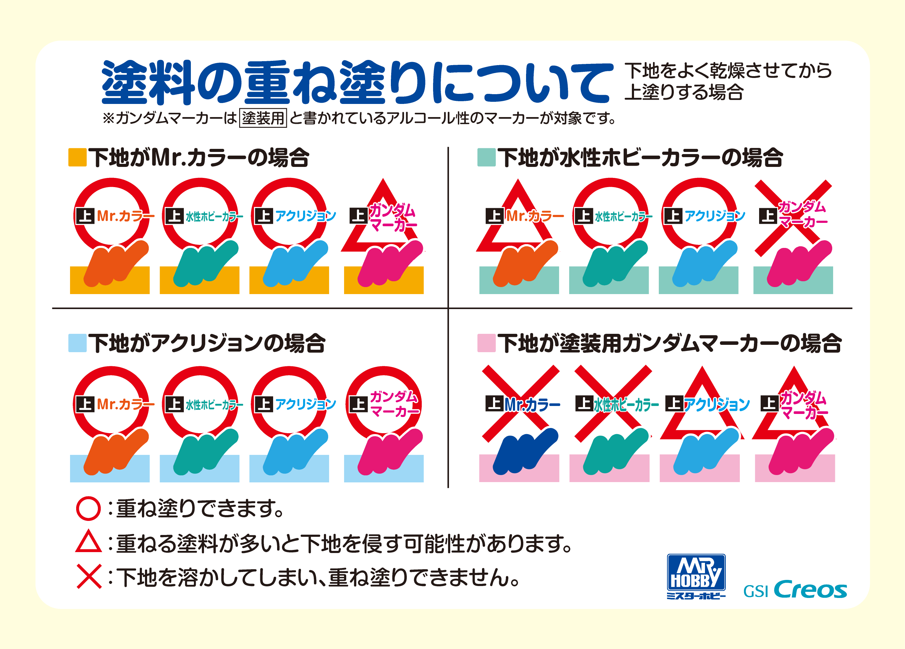 Mr. Hobbyブランドで販売されている塗料は、「ウェザリングカラー」などの一部を除き、「Mr.Color」、「水性ホビーカラー」、「アクリジョン」の3種に大きく分けることができます。