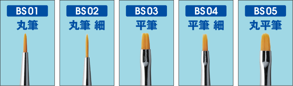 ●穂幅(筆毛の根本部分)×穂丈 BS01 1mm×7mm BS02 1mm×9mm BS03 3mm×6mm BS04 2mm×6.5mm BS05 3.5m×7mm